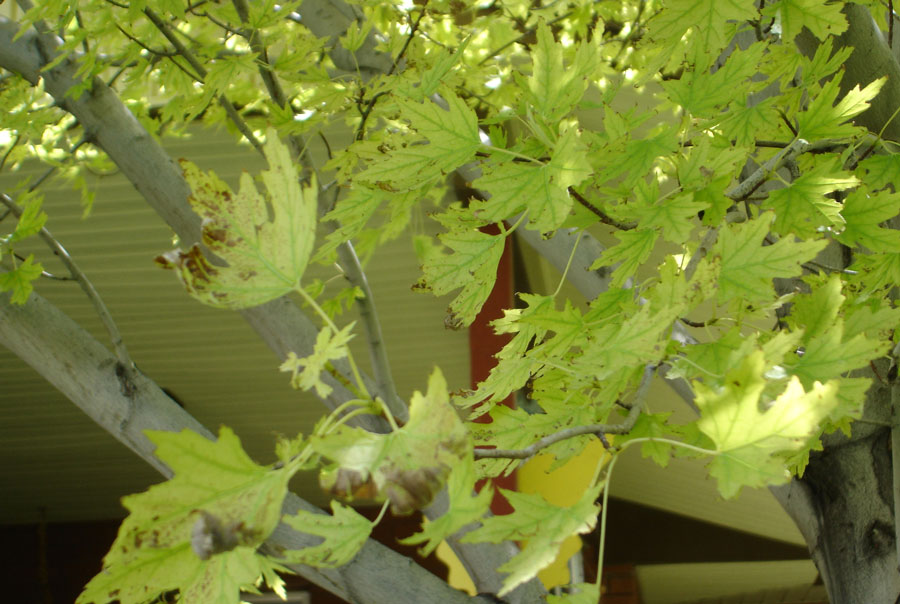 Because our soils are calcium-based, and calcium is a strong buffer, there is very little we can do chemically to reduce the soil pH. While sulfur can be added to achieve a temporarily drop, it is not economical to apply the amount of sulfur needed to effectively drop the soil pH for a reasonable amount of time. Regular application of chelated iron (EDDHA formulation) will help, as the chelated iron does not tie up as readily in the soil chemistry, remaining available for plant use.