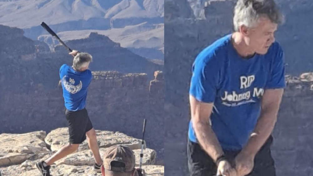 The incident happened shortly before 4 p.m. Sunday near the Yavapai Geology Museum on the South Rim of the canyon. Two images posted by the national park shows a man in a blue shirt swinging at a baseball on a tee near the ledge of the South Rim, launching the ball into the wide geological abyss.