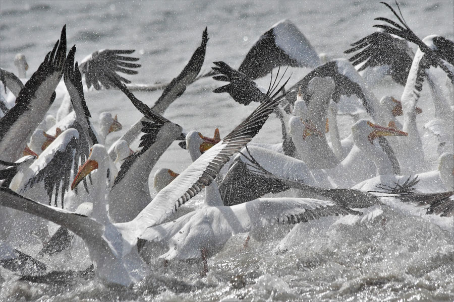 Locating about 100 American white pelicans in a cove on Mud Lake near willows and bulrush was too much of a temptation. I had to get a close-up picture of them. A howling wind rattling all the vegetation meant the noise I made would be muffled, so I could sneak up on them.
