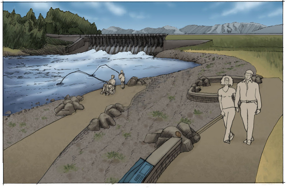 The design for the Jackson Lake Dam launch will provide improved boat launching conditions and the addition of accessible site features. Features include a boat ramp which will accommodate two vehicles at a time, fully accessible sidewalks leading to two accessible fishing platforms, expanded parking, and improved site amenities including picnic tables, bench seating, and bicycle parking. Additionally, visitor use areas for viewing and providing educational information about the Snake River will be established.