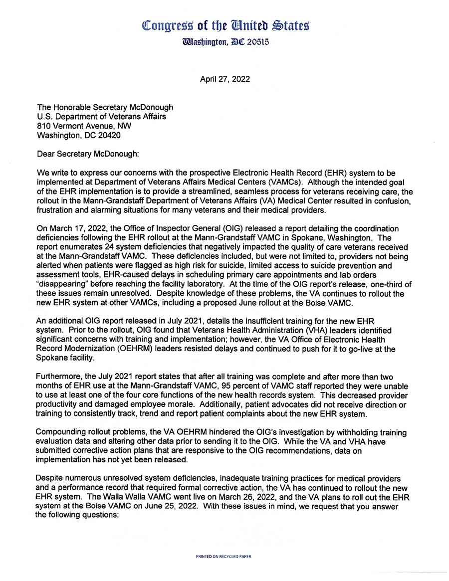 “Although the intended goal of the (Electronic Health Record system’s) implementation is to provide a streamlined, seamless process for veterans receiving care, the rollout in the Mann-Grandstaff Department of Veterans Affairs (VA) Medical Center resulted in confusion, frustration and alarming situations for many veterans and their medical providers,” the letter reads, in part.
