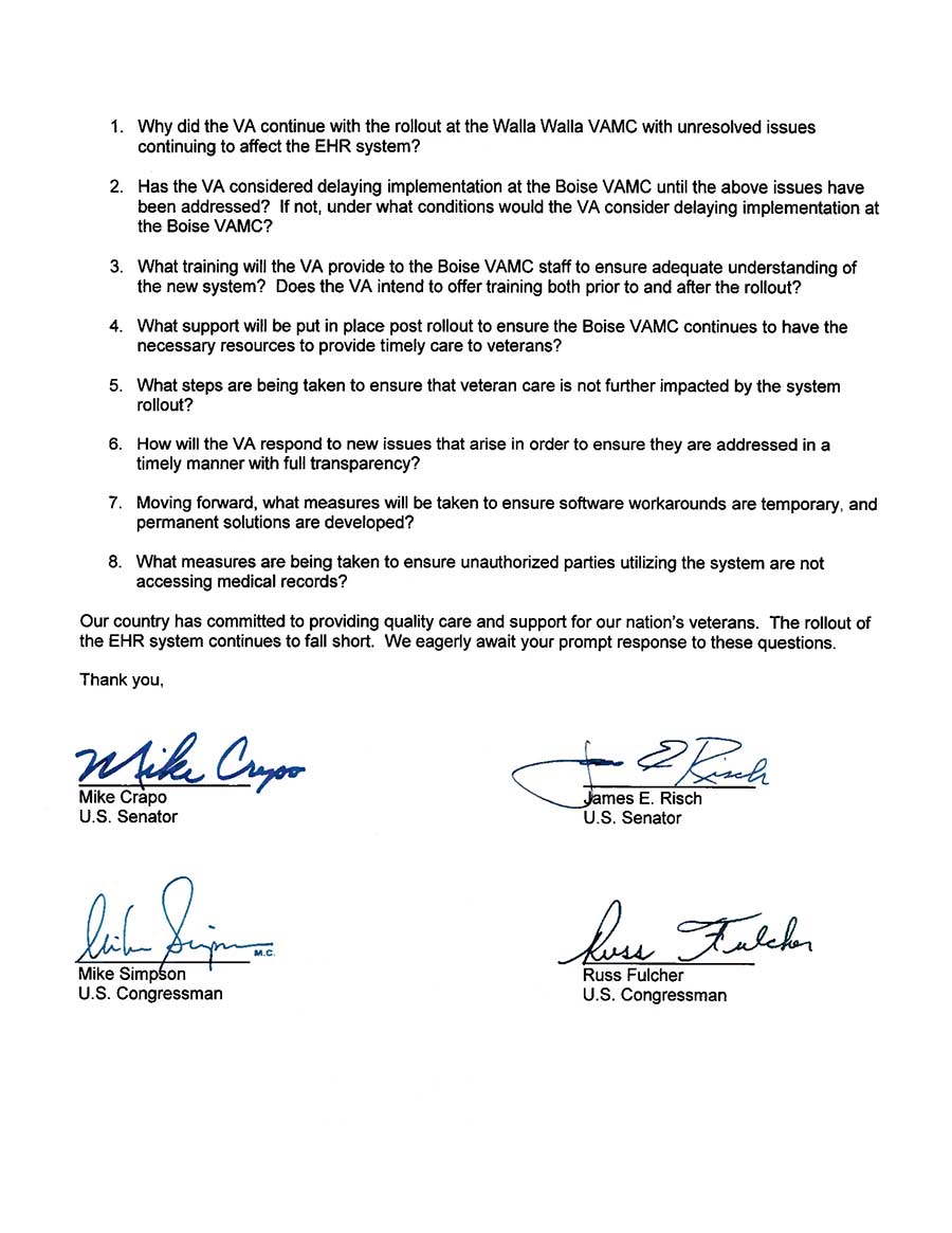Idaho’s congressional delegation – Crapo, Risch and U.S. Reps. Russ Fulcher and Mike Simpson – wrote a letter to McDonough in April expressing deep concern with the system and its rollout