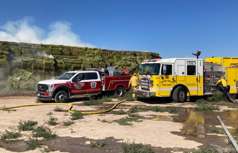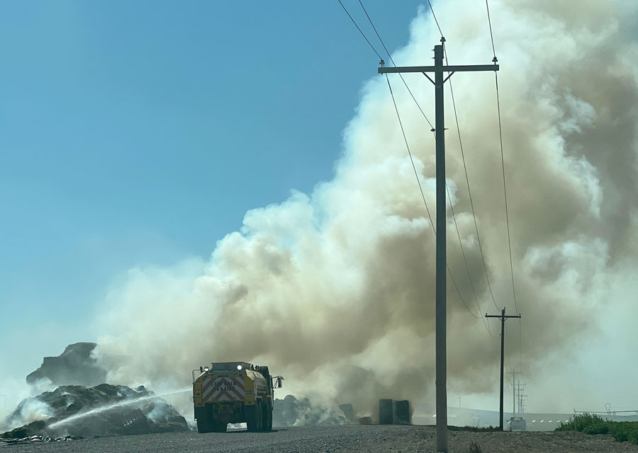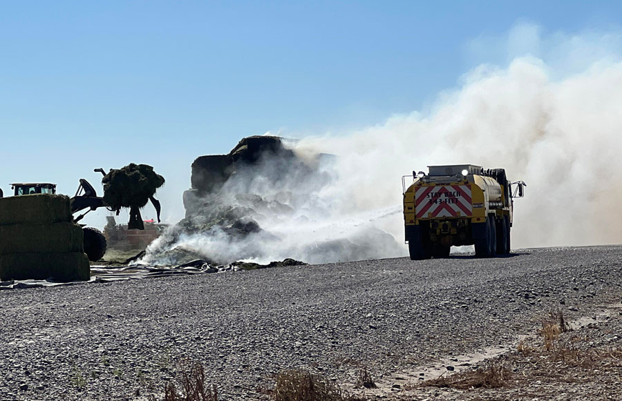 IFFD spokeswoman Kerry Hammon said firefighters worked with property owners to try to spread the hay with heavy equipment to better fight the fire. A small airplane was also being used to dump water on the hay.