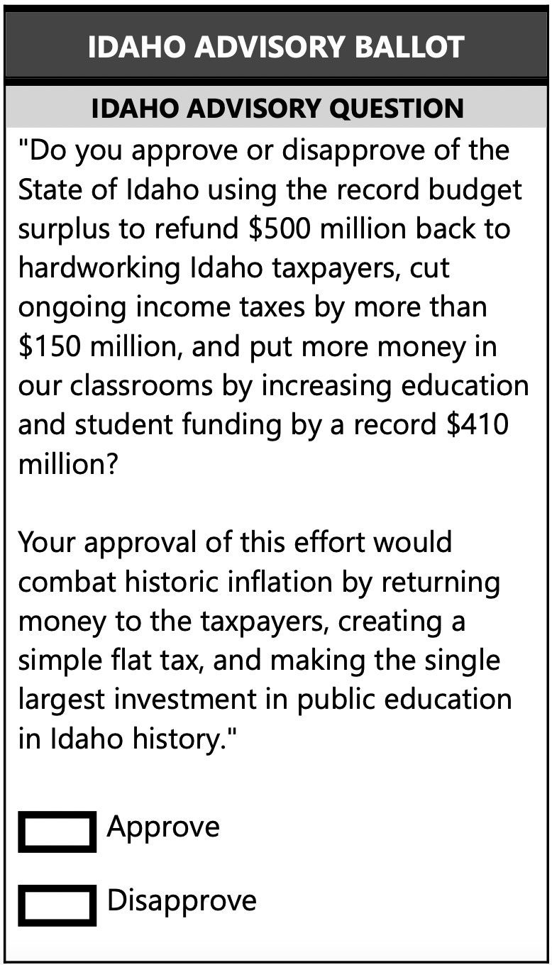 The nonbinding question will appear on the ballot as the Idaho Advisory Question. Voters will be asked whether they “approve” or “disapprove” of Little and the Idaho Legislature using the state’s $2 billion budget surplus to pay for $500 million in tax rebates, while approving ongoing income tax cuts and directing more than $410 million annually to public education and career training.