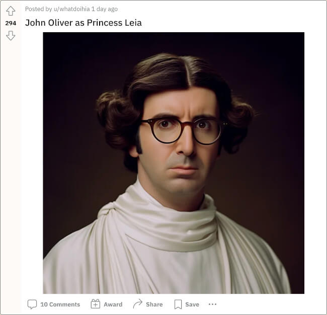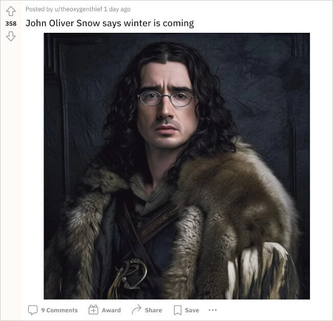 There have been numerous pictures of Oliver posing in sharply tailored suits, and screenshots of humorous moments from his show. There is Oliver as a koala. There are images of his face superimposed on the Mediterranean fruit commonly used to garnish martinis (“John Olive”). And an AI-generated image of Oliver as a “Game of Thrones” character (“John Oliver Snow”).