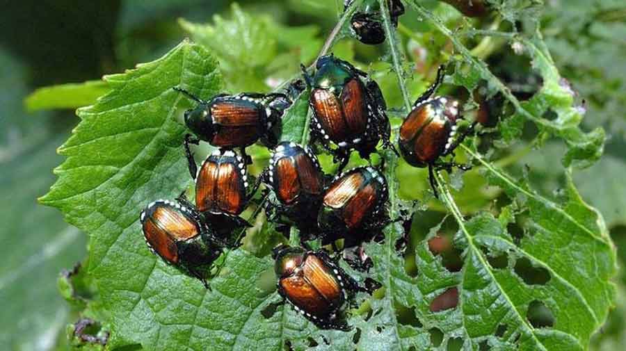 Anywhere there is grass, flowers or other foliage to eat, there’s a chance a Japanese beetle is present. The tiny insects feed on grass roots — like those found on golf courses, in parks and under home lawns — and over 300 different kinds of flowers and fruits.