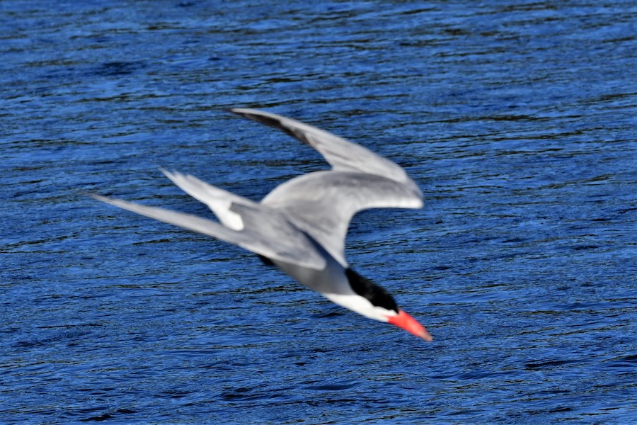 I watched as a pair of adult Caspians would catch small fish by either diving into the water headfirst, but mostly they would skim the top of the water, picking up small minnows on the surface. There were two immature terns following them. Sometimes, after capturing a small minnow the adult would appear to dispatch the fish and drop it back on the water for one of the immature terns to pick it up.