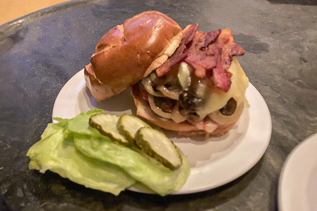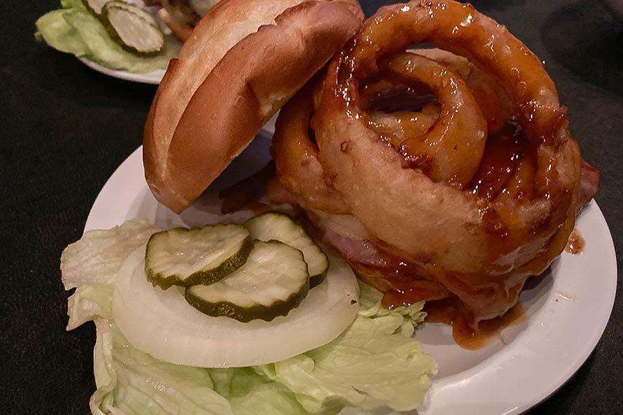 If someone isn’t as interested in the Rim Rock burger, they could also try the Cue & Brews burger, served with ham and bacon, topped with onion rings and smothered in a special tangy sauce.