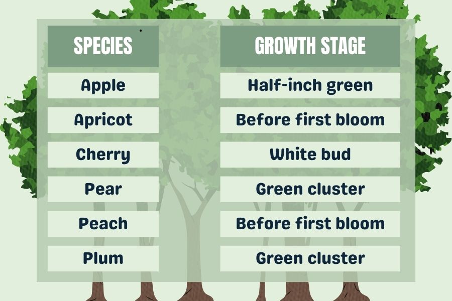 The timing at which you can effectively use “dormant” oil concentrations (2%) varies amongst fruit varieties. Generally, you want to target the window between bud swell and bud break. This timing balances adequate insect activity while allowing the 2% oil concentration for maximum control. If you want to be more specific, the last point at which you can safely apply oil for each crop is listed in the table above. For images of the development stages, see “Cold Effects On Fruit.”