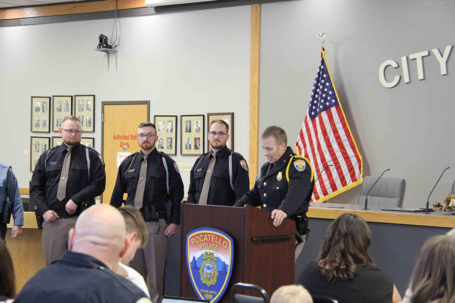 The three new patrol officers joining the Pocatello Police Department were Jessy King, Dillon Katzenstein and Noah Bake. Joshua Perkins was also sworn in as a code enforcement officer for the department.