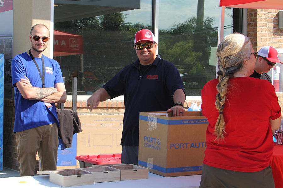 Nate Eaton, Nate Sunderland and Jordan Wood speak to a family at the raffle table. | Logan Ramsey, EastIdahoNews.com