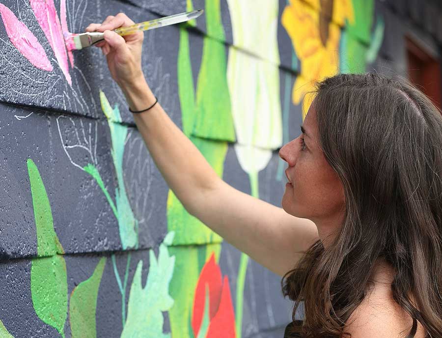 “The secret part about the process is that there’s this connection and energy that builds with the piece, and I feel like that energy stays with the piece,” she says. She hopes people who enjoy the art will take her lead in how they interact with the mural. She says nothing would make her happier than seeing others twirling among the flowers when they stop for a photo op.
