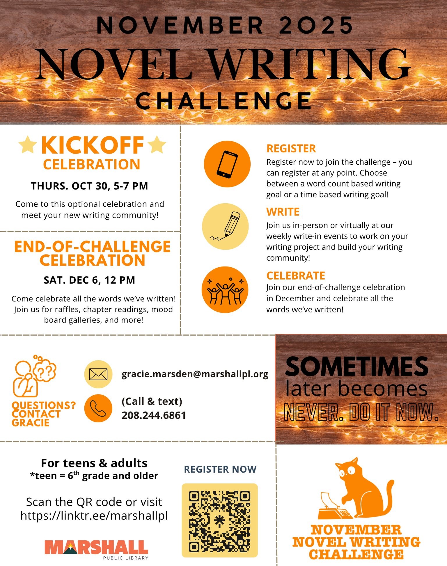 Do you have a book in you? Join me for Marshall Public Library’s November Novel Writing Challenge