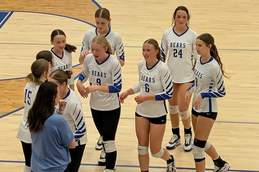 The Madison Bobcats huddle during a timeout in the third set of their straight-set victory over the Bees at Bonneville High School. | Kalama Hines, EastIdahoSports.com.