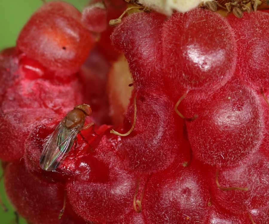 Spotted wing drosophila (SWD) (drosophila suzukii) is a small vinegar fly. Males of the species have distinctive spots on their wings. Unlike most fruit flies that target overripe or damaged fruit, SWD can pierce the skin of healthy, ripening fruit and lay eggs inside. It affects a wide range of berries and soft fruits and is listed as an invasive insect pest by the Idaho State Department of Agriculture.