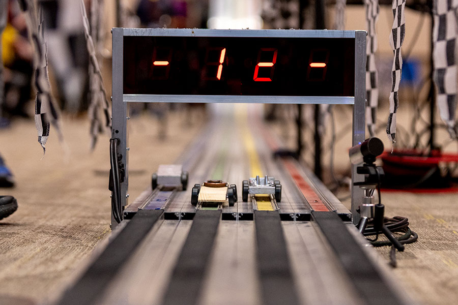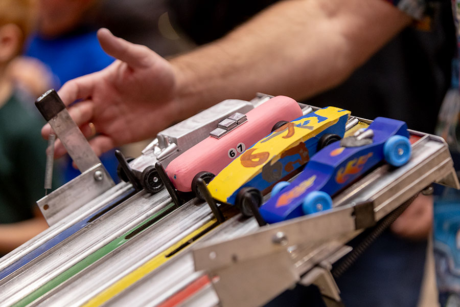 The races consisted of four derby cars pitted against each other, and the track recorded times to the thousandths of a second for each racer. The track also contained a camera that allowed parents and the children to watch in slow motion as their cars crossed the finish line.