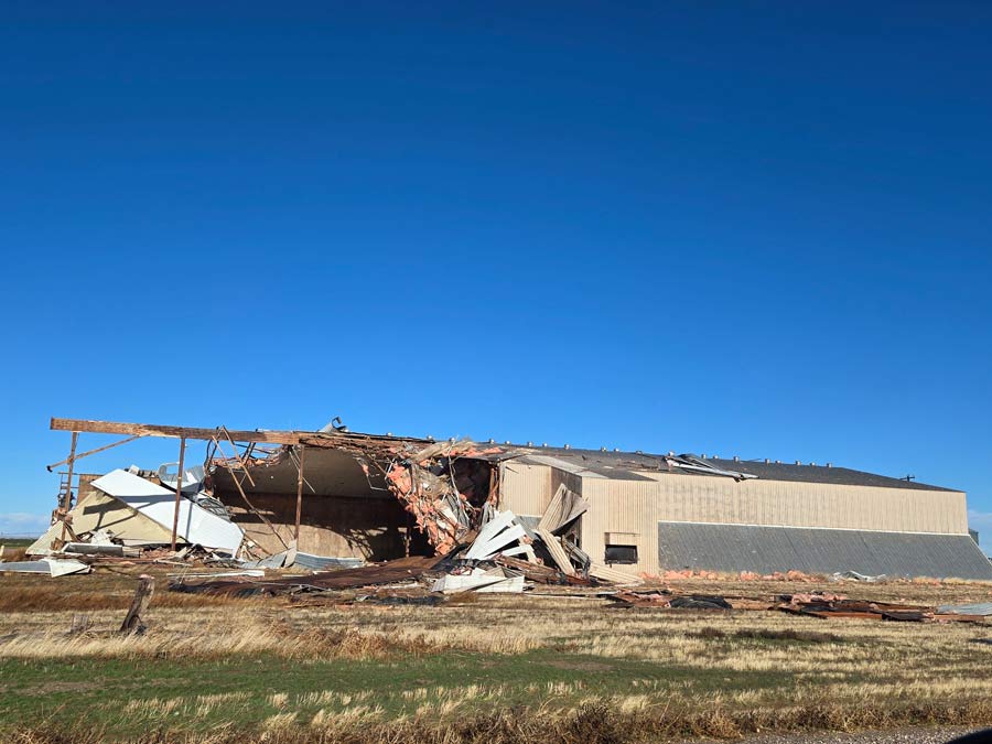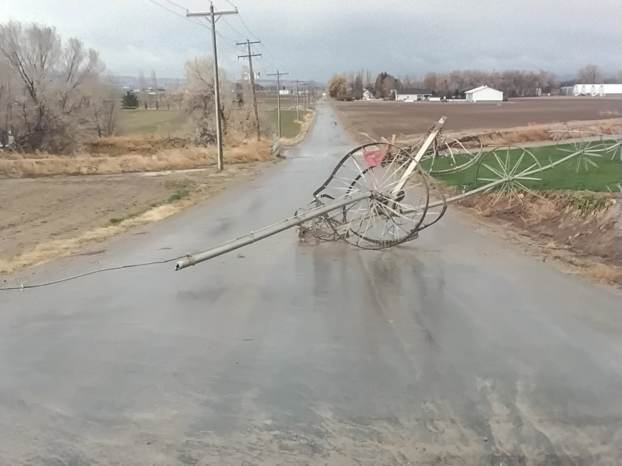 An EastIdahoNews.com reader sent us a number of photos showing fallen power lines and irrigation equipment blown into the road. Another reader from American Falls sent in a photo showing damage to a large structure, presumably due to the storm.