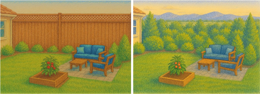 Perhaps there is a busy road or an unsightly industrial building that you want to cover from view. Privacy fences, hedge plantings and trees — or a combination of all three — can help create a personal oasis amid busy living. However, these may also cut you off from stunning views or other appealing scenery, creating a closed-in, claustrophobic feeling.