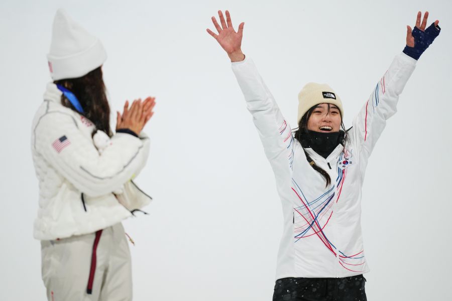 Kim didn’t make it past her first double cork. She skidded down the halfpipe, bounced back up, dusted herself off and rode down. She hugged bronze medalist Mitsuki Ono of Japan, then rushed over to Choi to join a swarm of Korean coaches who were hugging the new champion.