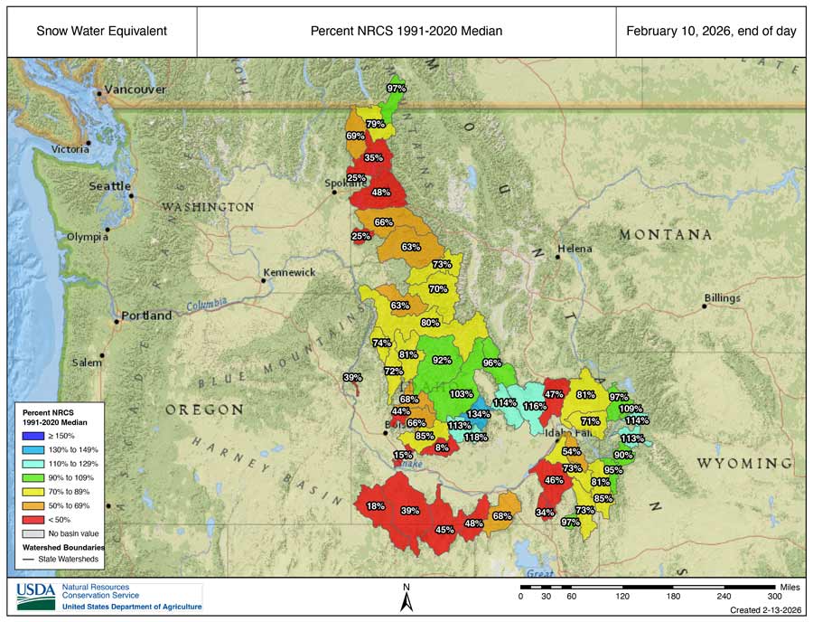 For example, the Portneuf subbasin has received 97% of its median precipitation since the start of the water year on Oct. 1, but its current SWE is 46% of the median. Dallon said this is because the Portneuf sits at an elevation low enough that, when precipitation falls, it’s taken the form of liquid rain due to the high temperatures.