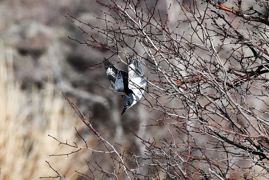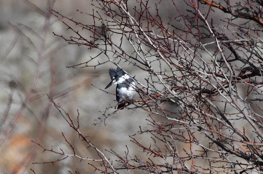 For the first time in years, I was able to drive up the dirt road east of the bridge where the kingfishers were roosting in the hawthorns. They were using the perches to watch the water for small fish to come to the shallows to feed on the hatching insects.