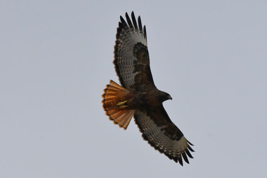 As I was driving along the canal leading to the Chester Dam, I saw a beautiful dark-morph red-tailed hawk soaring in circles, showing off its dark red tail.