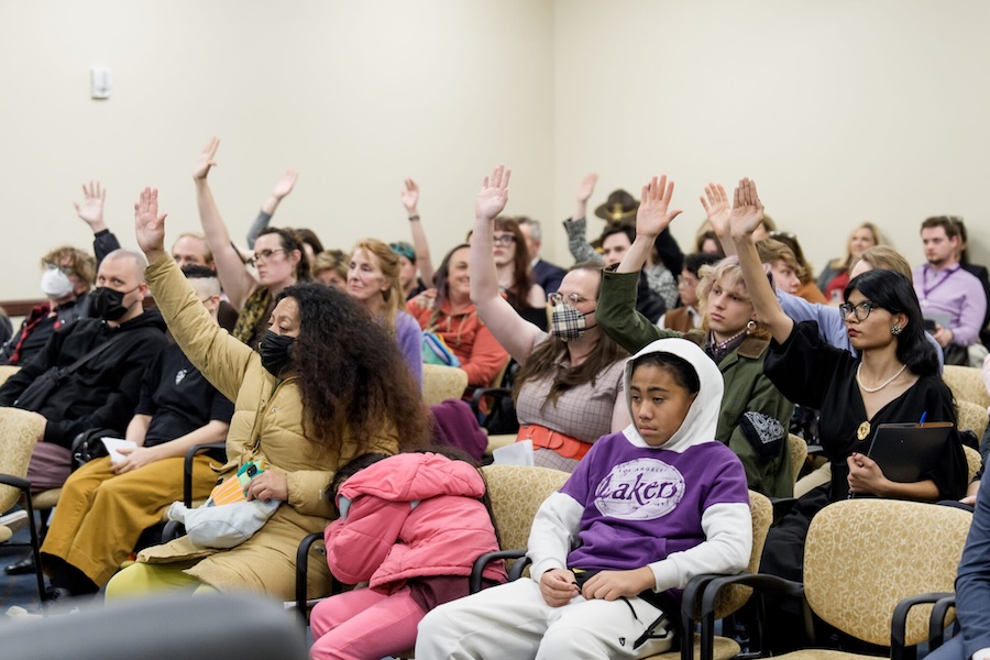 People raise their hands to indicate their opposition to HB193 in the Senate Business and Labor Standing Committee, at the Capitol in Salt Lake City on Thursday, Feb. 19, 2026.