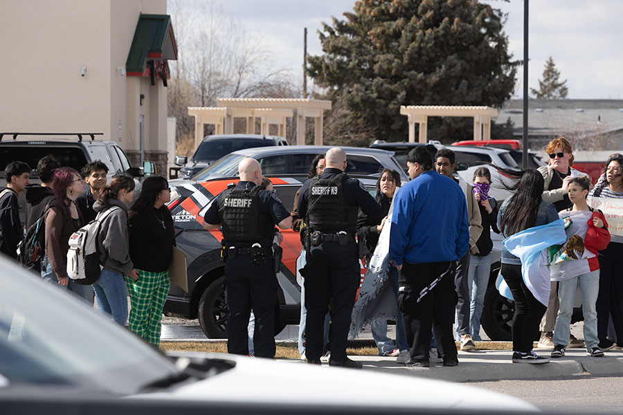 Two deputies with the Bonneville County Sheriff’s Office speaking with students. Walkout organizers said the deputies were telling students to stay out of the roundabout for safety. | Daniel V. Ramirez, EastIdahoNews.com