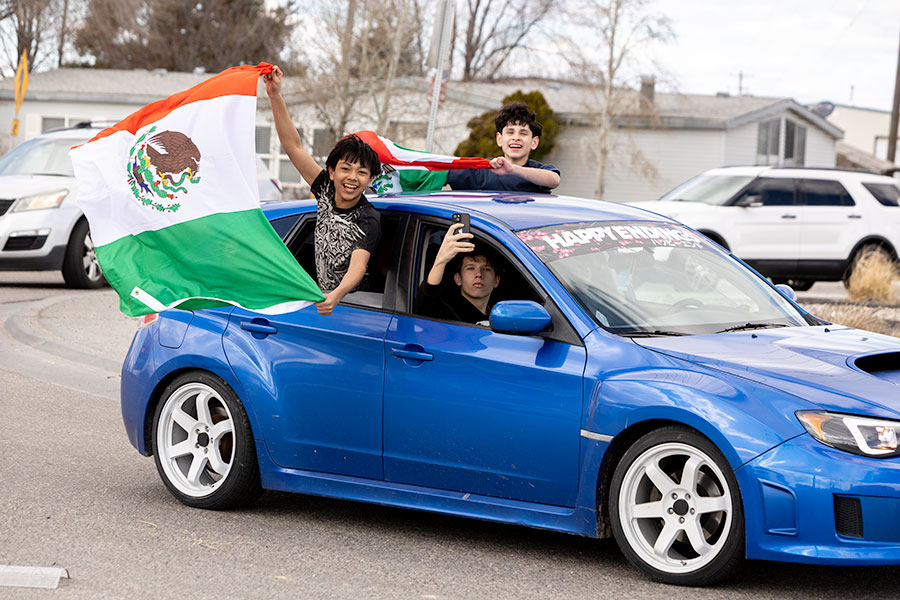 Group of students waving a Mexican flag out of a car during Friday’s walkout by students from Bonneville School District 93. | Daniel V. Ramirez, EastIdahoNews.com