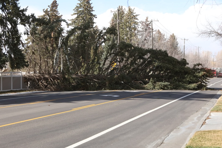 High winds toppled a large pine tree near Tautphaus Park in Idaho Falls on Saturday. | Daniel Ramirez, EastIdahoNews.com