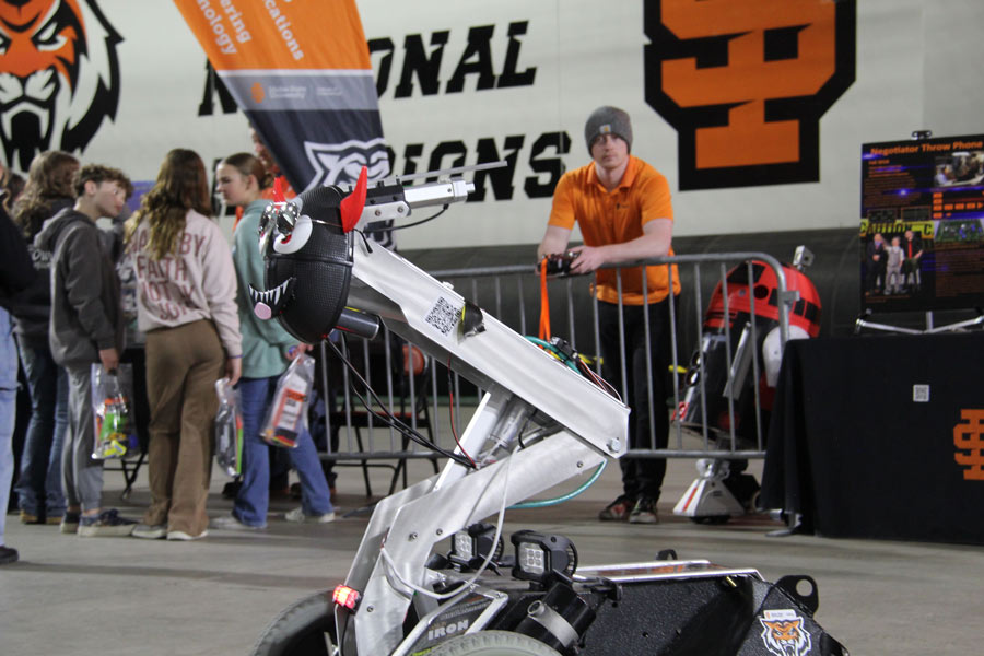 Some of the students who were showcasing their own projects were the students tabling for the Robotics and Communications Systems Engineering Technology program. People who wandered by likely saw students using a remote-control to wheel around a number of robots in front of the table.