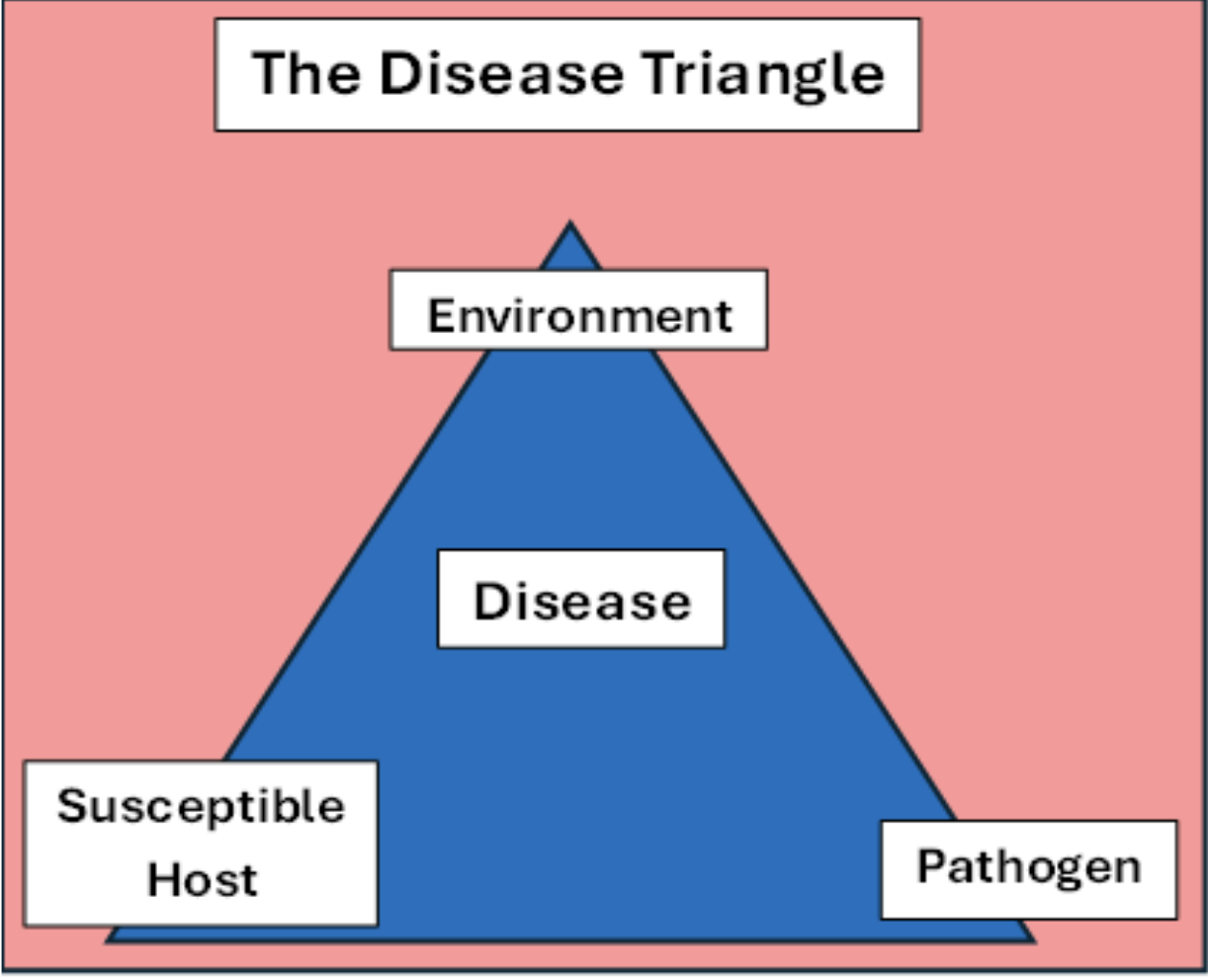 A simple way to visualize plant disease is using the disease triangle. A disease requires a pathogen, a susceptible plant and favorable environmental conditions. Like a triangle, all three parts are necessary for a disease to develop. If one is not present, it will not occur.