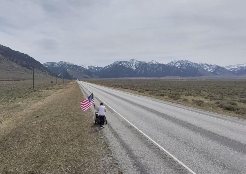 ISLAND PARK — Drivers traveling between Island Park and St. Anthony this week may have done a double-take. Battling wind, rain and snow, a lone runner pushing a three-wheeled cart with an American flag has been making his way along U.S. Highway 20.