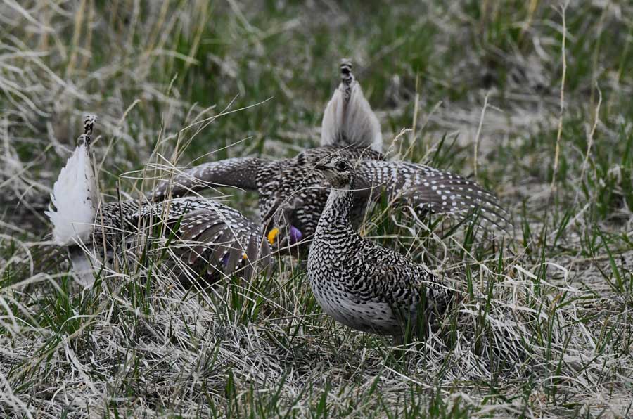 Like the greater sage grouse, the sharpie hens choose who they mate with — and that is usually the top three or four dominant males on each lek.