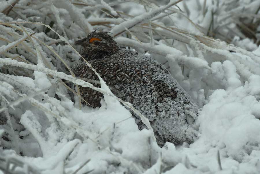 A male is hiding behind a clump of grass during a blizzard after the hens have left the lek.