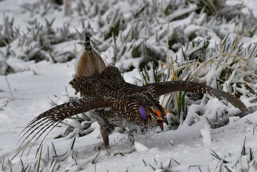A beautiful male sharp-tailed grouse kicks up snow as it dances in the foothills east of Rexburg in April 2026. | Bill Schiesss, EastIdahoNews.com