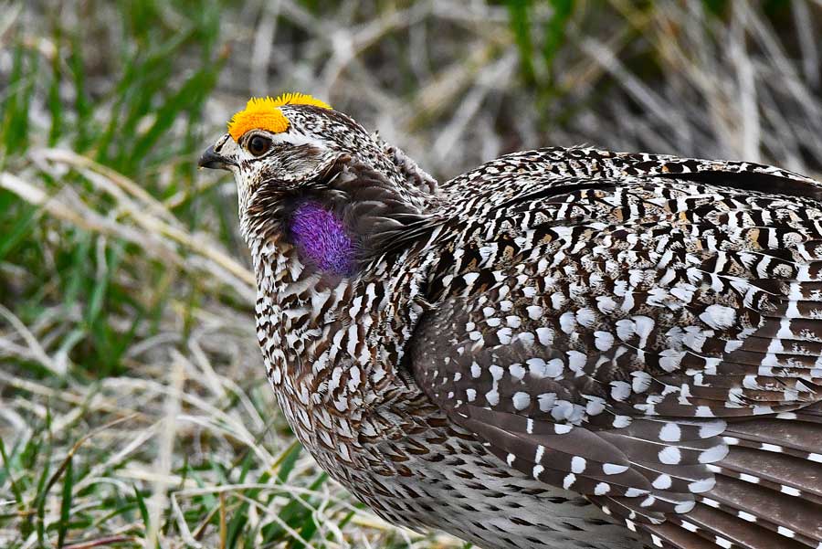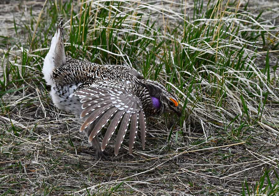 A male sharp-tailed grouse “hoots” by puffing out his purple air sacs on his neck. | Bill Schiess, EastIdahoNews.com