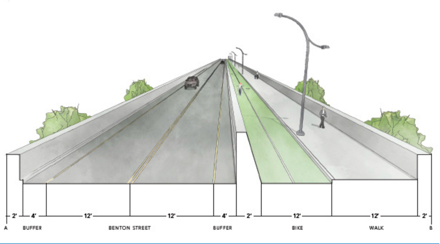 The overpass, which crosses the railroad tracks, currently has four lanes for vehicle traffic, with 5-foot sidewalks on each side. This bridge would have two driving lanes, as well as a 12-foot sidewalk and a 12-foot bike lane, which would be separated from the driving lanes by a 2-foot concrete barrier.