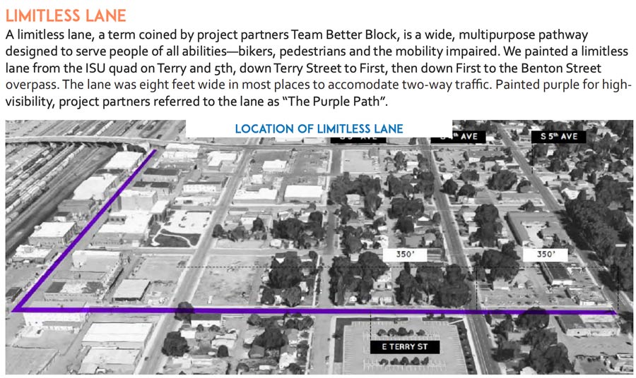 In 2018, Pocatello released a report on preliminary research into a potential pedestrian and cycling project, called the Terry First Final Report. This research included a project in which a team painted a temporary multipurpose pathway (called a “limitless lane”) that would run along Terry Street from South 5th Avenue, down to South 1st Avenue, over to the Benton Street Overpass.
