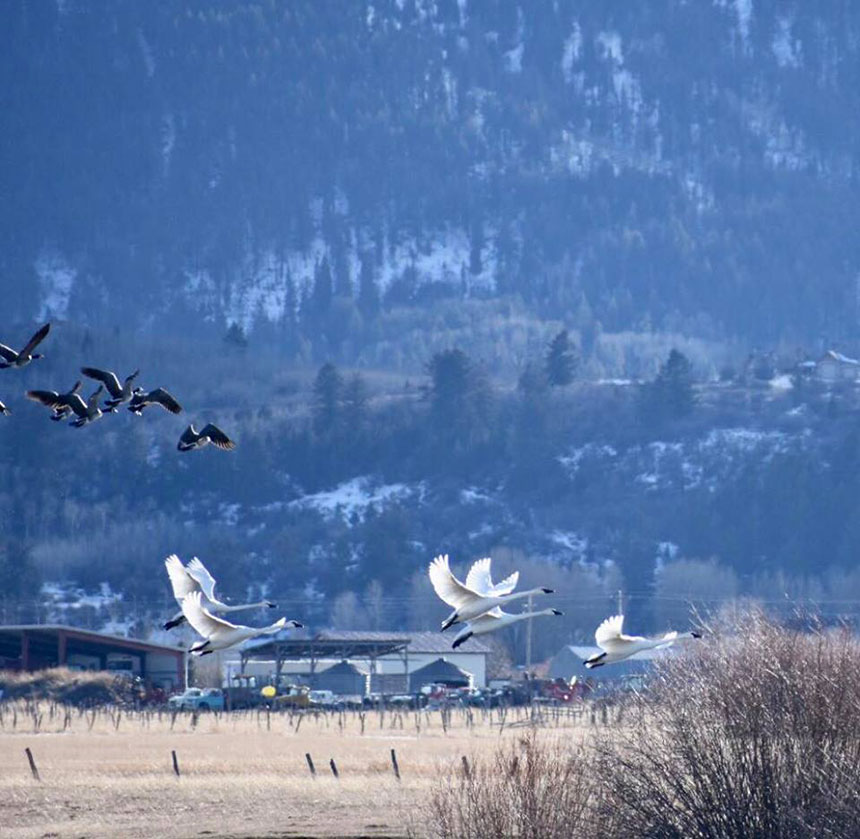 DPAnna Kirkpatrick. Bates Bridge in Driggs. Trumpeter Swans in flight with some Cormorants thrown in for good measure February 2018