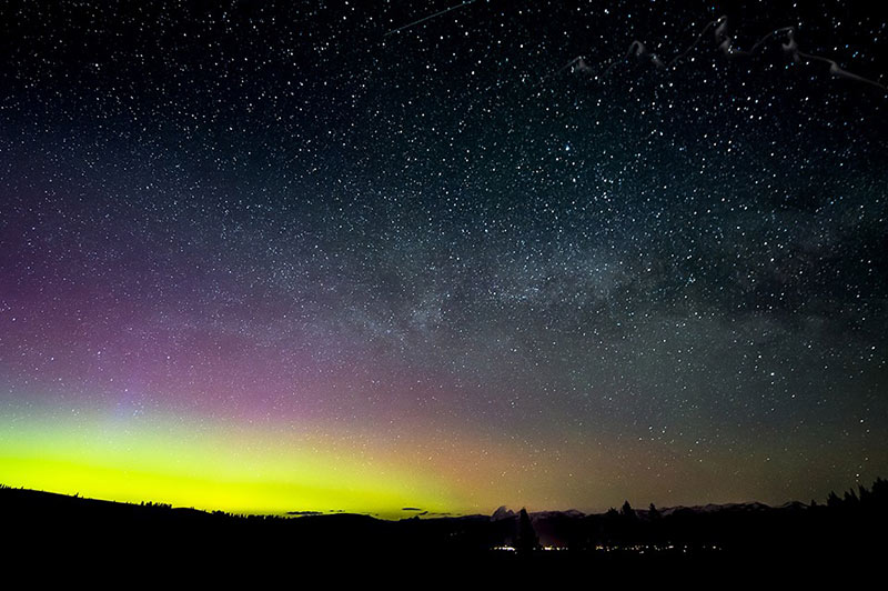 Josh Myers.The Start of the Northern Lights on top of Pine Creek Pass. You can see the Tetons in bottom right and the town of Victor.
