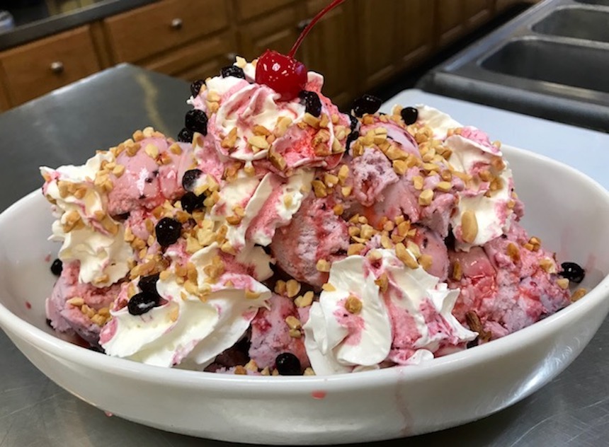 The SIX scoops of huckleberry ice cream are topped with huckleberries, huckleberry syrup, nuts, whipped cream and, of course, a cherry on top.